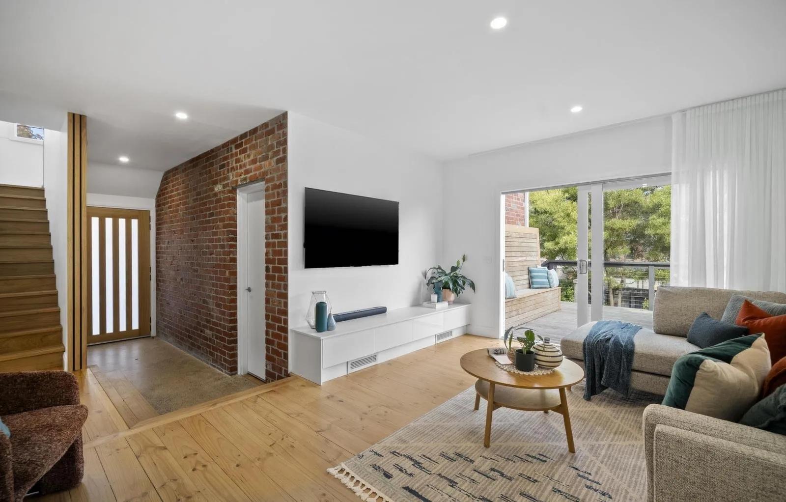 An impressive entry with exposed aggregate floor and reclaimed brick feature wall steps up to open plan living highlighted by polished hardwood flooring.